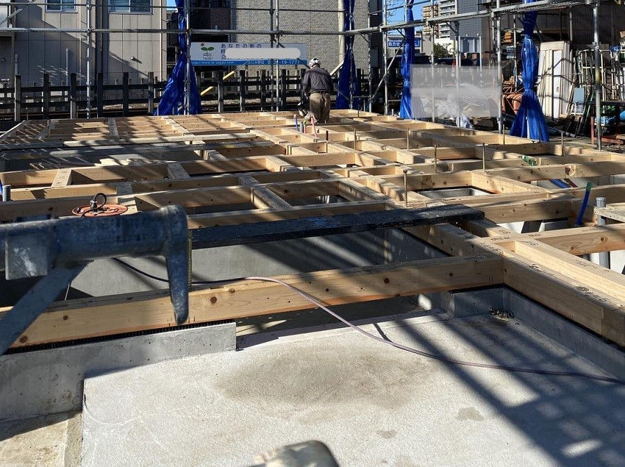 基礎コンクリートが打ちあがりましたので、その上に建物本体の骨組み(構造)のベースとなる土台を敷いていきます。本体の一番下にあり、金物で基礎と緊結し建物の重さを支える役目を担っていますよ。くるりの家は埼玉県の木 西川材のヒノキを使用しています。